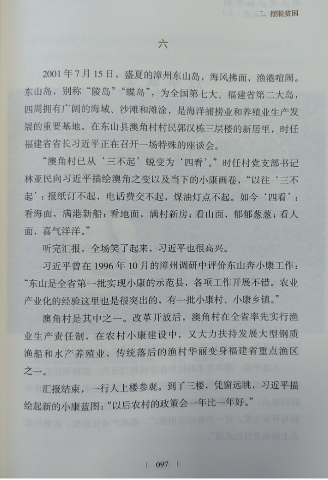 2001年7月15日,盛夏的漳州东山岛,海风拂面,渔港喧闹。东山岛,别称“陵岛”“蝶岛”,为全国第七大、福建省第二大岛,四周拥有广阔的海域、沙滩和滩涂,是海洋捕捞业和养殖业生产发展的重要基地。在东山县澳角村村民郭汉栋三层楼的新居里,时任福建省省长习近平正在召开一场特殊的座谈会。 “澳角村已从‘三不起’蜕变为‘四看’。”时任村党支部书记林亚民向习近平描绘澳角之变以及当下的小康画卷,“以往‘三不起’:报纸订不起,电话费交不起,煤油灯点不起。如今‘四看’:看海面,满港新船;看地面,满村新房;看山面,郁郁葱葱;看人面,喜气洋洋。” 听完汇报,全场笑了起来,习近平也很高兴。 习近平曾在1996年10月的漳州调研中评价东山奔小康工作:“东山是全省第一批实现小康的示范县,各项工作开展不错。农业产业化的经验这里也是很突出的,有一批小康村、小康乡镇。” 澳角村是其中之一。改革开放后,澳角村在全省率先实行渔业生产责任制,在农村小康建设中,又大力扶持发展大型钢质渔船和水产养殖业,传统落后的渔村华丽变身福建省重点渔区之一。 汇报结束,一行人上楼参观。到了三楼,凭窗远眺,习近平描绘起新的小康蓝图:“以后农村的政策会一年比一年好。”